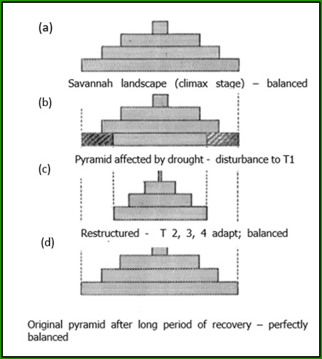 This balance, however, is dynamic. Let’s consider a Savanna ecosystem in a state of perfect balance among all trophic levels, referred to as a climax state (see Fig. 6.4). If the vegetation at T1 diminishes due to factors like drought or an overpopulation of rabbits surpassing the veldt’s carrying capacity, their food supply will dwindle, leading to the death of many rabbits.