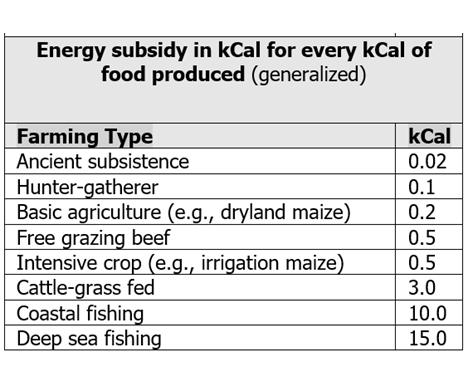 Despite scientific and technological agricultural developments of the past, such as the Green revolution, (see Agricultural Revolutions) which brought about the widespread adoption of agrochemicals and cross-breeding of plants, GMO’s, cloning, CRISPR gene editing, etc.) The values in the Table (below left) show the energy required for producing enough food for the world’s population, is becoming increasingly inefficient.