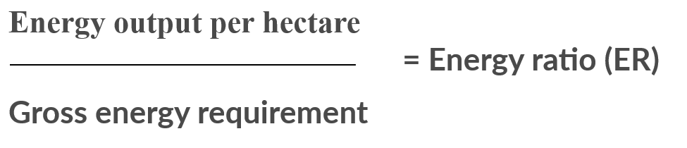 It is therefore important to find the ratio between energy requirements and the production of every crop. The gross energy requirement (GER) can be determined by reducing all the energy inputs to a standard value and then adding them together.
