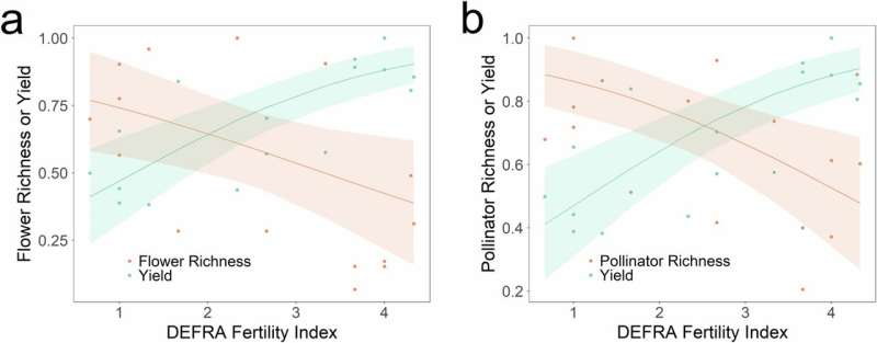 They also identified a trade-off between flower and pollinator diversity and grassland yield. To maximize flowering plant species richness, and hence also pollinator species richness, a significant drop in fertility is required—but this will reduce yields.
