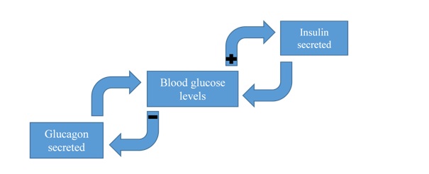 Figure 7: In a normal glucose cycle, increases in blood glucose levels detected by the pancreas will result in the beta cells of the pancreas secreting insulin until normal blood glucose levels are reached. Whereas if low blood glucose levels are detected, the alpha cells of the pancreas will release glucagon to raise blood glucose levels to be normal.